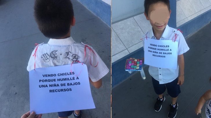 En una publicación que se ha hecho viral en Facebook se observa a un menor con un letrero que dice “Vendo chicles porque humillé a una niña de bajos recursos”.
