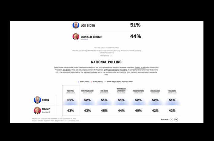 Ciudad de México/Los Ángeles/Washington (SinEmbargo).– No hay nada decidido en las elecciones de Estados Unidos. La última encuesta de NBC News/Wall Street Journal/Telemundo le da 8 puntos de ventaja al demócrata sobre el republicano, pero el poll of polls (encuesta de encuentras) de CNN le da a Joe Biden 51 por ciento y a Donald Trump 44, con lo que la diferencia es apenas de 7 puntos porcentuales.