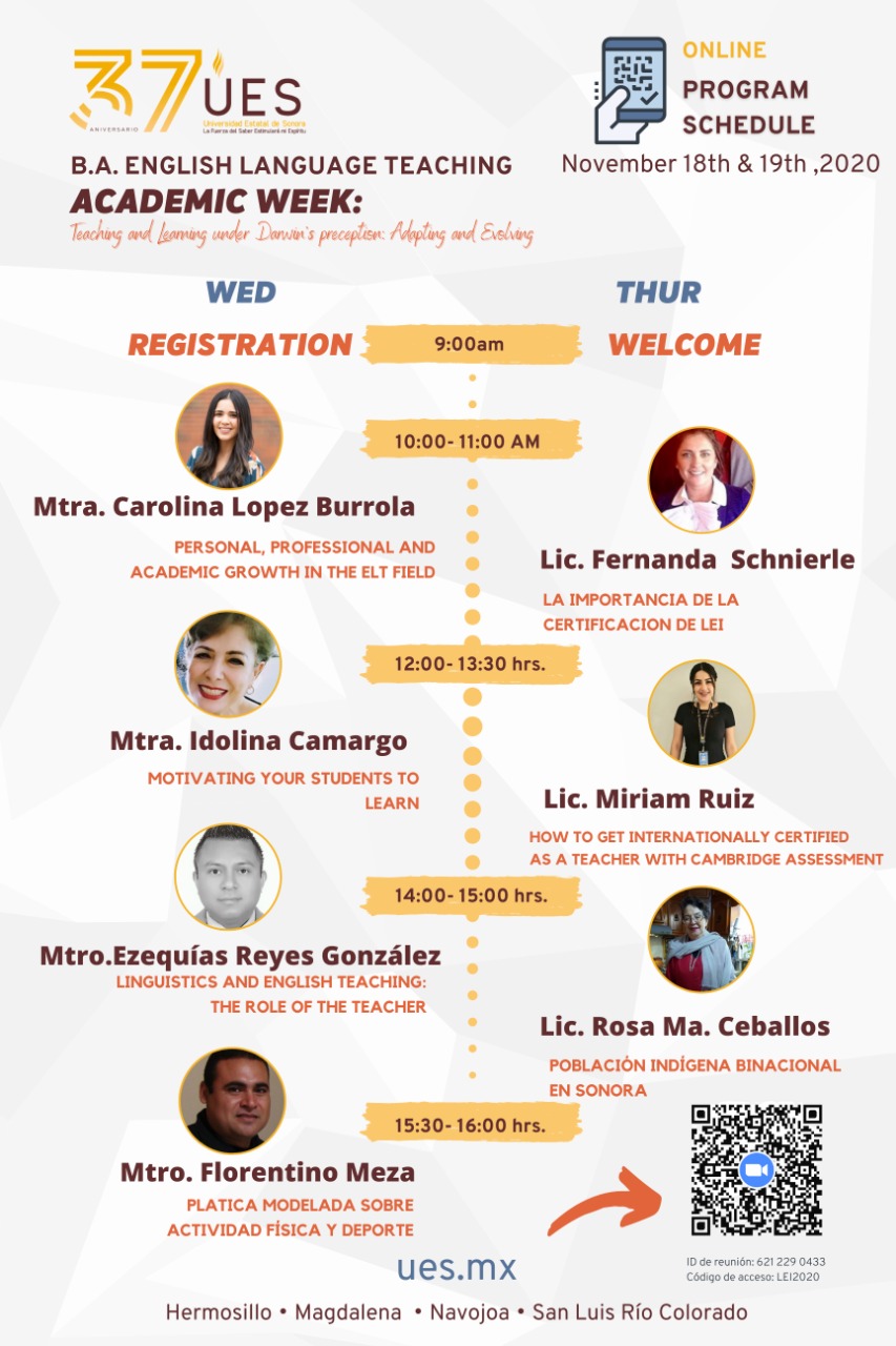 El jueves 19 de noviembre se presentan: “La importancia de la Certificación de LEI” de Fernanda Schnierle, “How to get internacionally certified as a teacher with Cambridge assesment” de Miriam Ruiz y se concluye con “Población indígena binacional en Sonora” de Rosa María Ceballos.