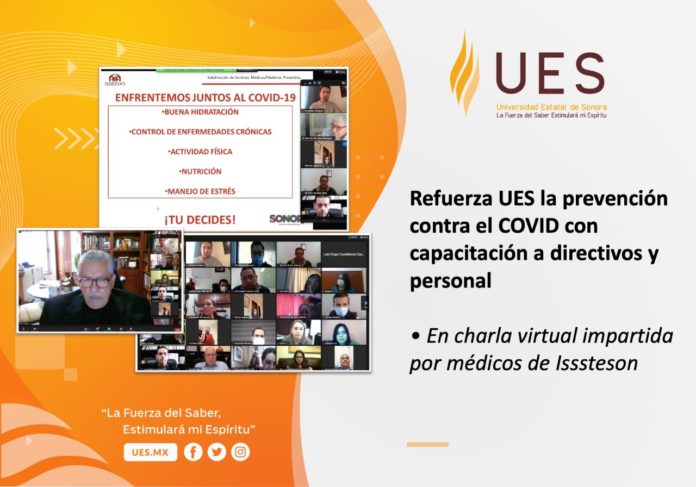 Hermosillo, Sonora; diciembre 10 de 2020. Para reforzar las medidas de prevención del covid entre la comunidad de la Universidad Estatal de Sonora (UES), médicos de Isssteson impartieron la charla virtual “¡Tú decides! Enfrentemos juntos al covid-19”, a autoridades y personal de la universidad de las distintas Unidades Académicas en el estado.