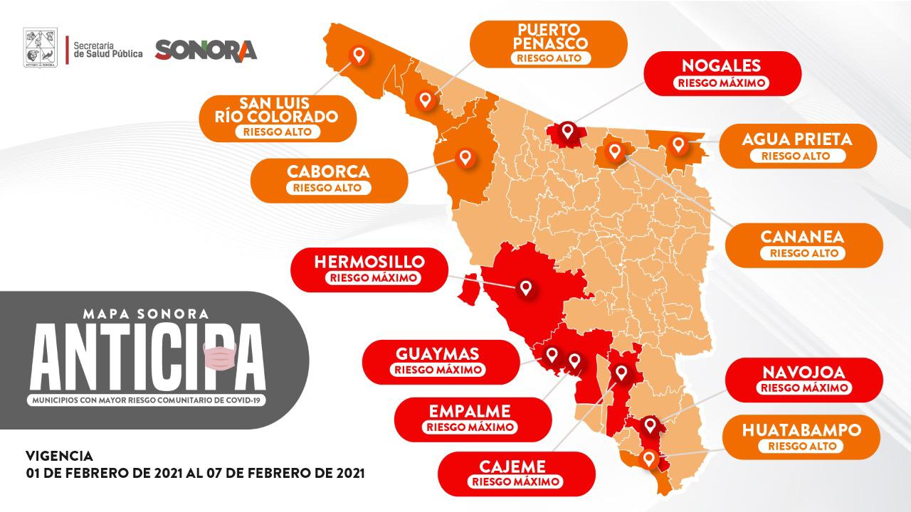 En el Mapa Sonora Anticipa de esta semana, cuya vigencia comprende del 01 al 07 de febrero, el nivel de riesgo de estos municipios se clasifica de la siguiente manera: