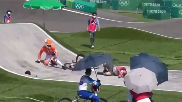 El corredor Niek Kimmann terminó con la rodilla lastimada, después de que un oficial de Tokio 2020 se cruzara en la pista de carreras de BMX.El corredor Niek Kimmann terminó con la rodilla lastimada, después de que un oficial de Tokio 2020 se cruzara en la pista de carreras de BMX.