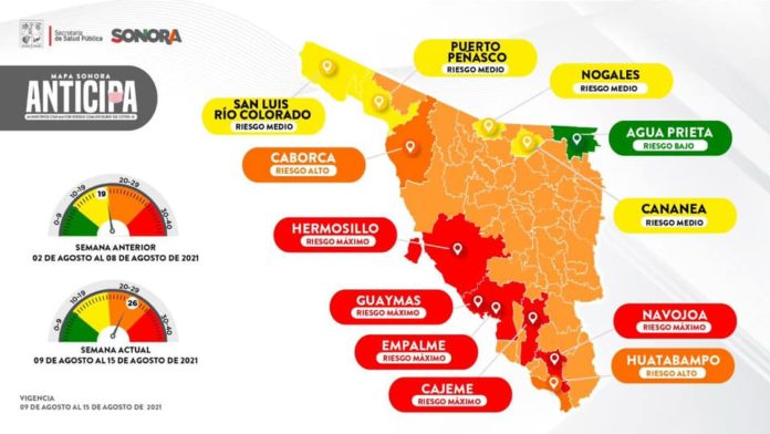 Informó que en la actualización del Mapa Sonora Anticipa, del 9 al 15 de agosto de 2021, contempla en riesgo alto a Caborca y Huatabampo; en riesgo medio: San Luis Río Colorado, Puerto Peñasco, Nogales y Cananea y en riesgo bajo: Agua Prieta