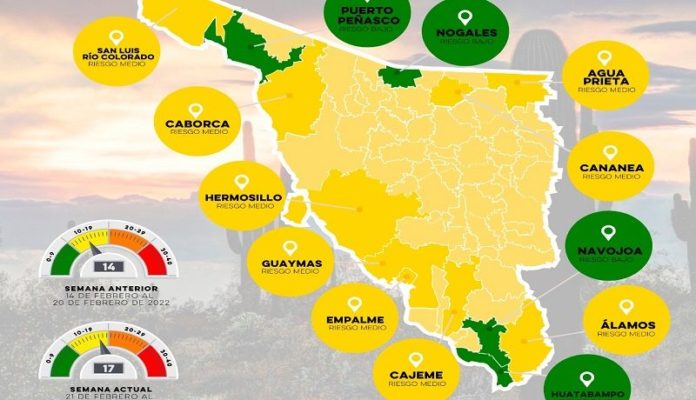 Entre el 21 y 27 de febrero en riesgo medio (o amarillo) se encontrarán Caborca, San Luis Río Colorado, Guaymas, Empalme, Cajeme, Agua Prieta, Cananea y Álamos.