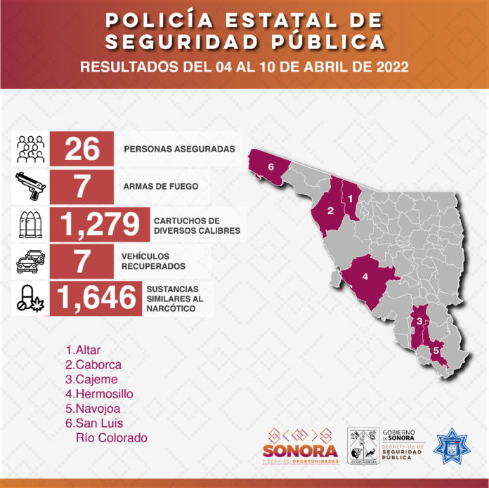 Los operativos permanentes de la Policía Estatal de Seguridad Pública (PESP) en Altar, Caborca, Cajeme, Hermosillo, Navojoa y San Luis Río Colorado, arrojaron como resultado el aseguramiento de 26 personas, siete armas de fuego, mil 279 cartuchos de diversos calibres, siete vehículos recuperados y mil 646 sustancias similares al narcótico aseguradas.