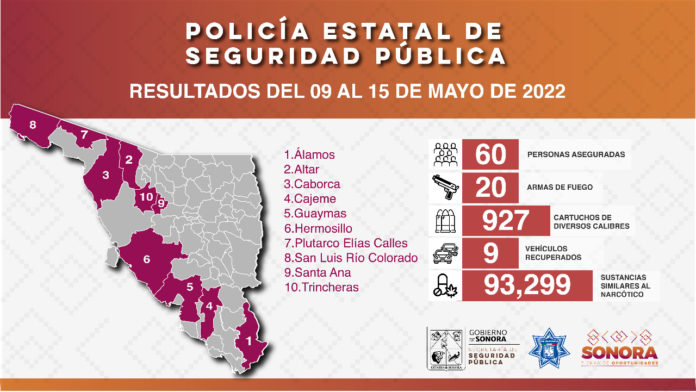 Los resultados se registraron desde 9 al 15 de mayo durante operativos que la PESP desplegó en coordinación con los tres órdenes de gobierno en Cajeme, Hermosillo, Altar, Guaymas, Caborca, Santa Ana, San Luis Río Colorado, Trincheras, Álamos y General Plutarco Elías Calles.