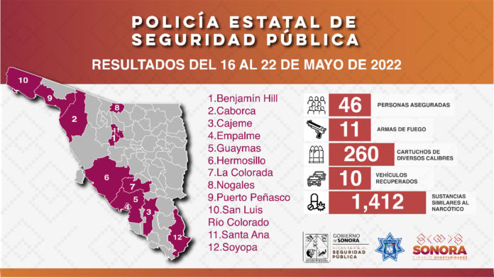 Durante la semana del 16 al 22 de mayo la Policía Estatal de Seguridad Pública (PESP) realizó el aseguramiento de 46 personas. Además, durante operativos en diversos municipios de Sonora incautó sustancias prohibidas similares al narcótico, armamento y vehículos robados.