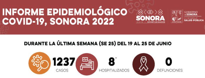La Secretaría de Salud de Sonora (SSA) confirmó que durante la semana epidemiológica 25, que abarca del 19 al 25 de junio, se registraron mil 237 nuevos casos y ninguna defunción por Covid-19.
