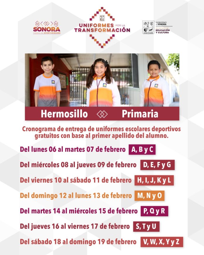 Del lunes 6 al domingo 19 de febrero se entregarán los paquetes de uniforme escolar deportivo, por orden alfabético, al alumnado de primaria en Hermosillo, Etchojoa, Huatabampo y Benito Juárez, anunció Samuel Espinosa Guillén.