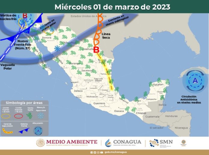Se espera que mañana miércoles por la tarde ingrese, por el noroeste de Sonora, el frente frío 37, asociado a un vórtice de núcleo frío y la corriente en chorro polar, con probabilidad de lluvias dispersas en los municipios del noroeste, norte, noreste y oriente, así como caída de aguanieve o nieve, en los municipios del norte, noreste y oriente.