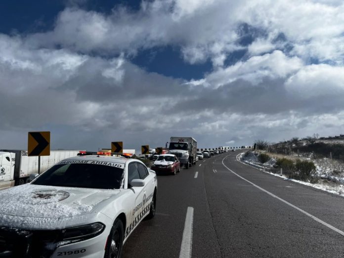 Gracias al intenso trabajo coordinado entre autoridades de los tres niveles de gobierno, queda reestablecida la circulación en el Puerto San Luis, tramo carretero Agua Prieta – Janos, tras intensa nevada; en el caso del tramo Ímuris – Cananea la circulación se mantiene cerrada.
