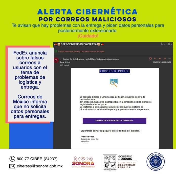 La Unidad Cibernética de la Secretaría de Seguridad Pública de Sonora, detectó correos electrónicos de estafadores que suplantan las identidades de las empresas Fedex y Servicio Postal Mexicano (Sepomex), por lo cual alertó a la ciudadanía a extremar medidas de prevención para evitar ser víctimas de fraude.