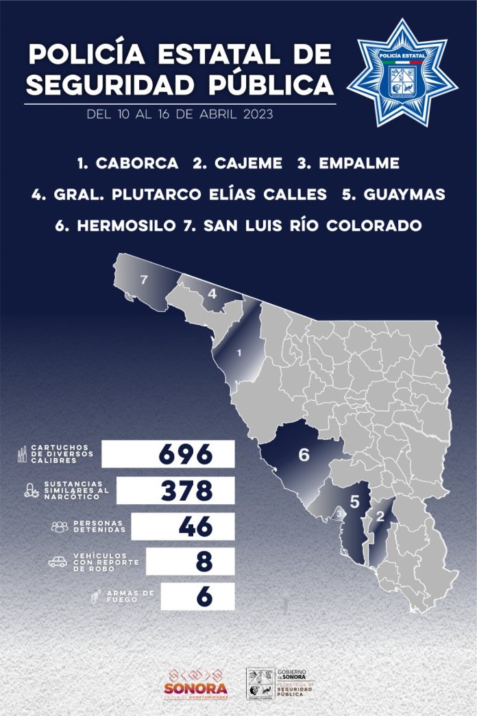 En acciones contra el delito, 46 personas quedaron detenidas durante operativos que realizaron oficiales de la Policía Estatal de Seguridad Pública (PESP) en apoyo a la seguridad ciudadana en municipios de Sonora.