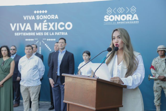 Acompañada por diputados y diputadas de la LXIII Legislatura, personal administrativo y de apoyo, la presidenta del Congreso del Estado, diputada Claudia Zulema Bours Corral, encabezó este día la ceremonia de honores a la bandera por motivo del 213 aniversario del inicio de la Independencia de México, celebrada en la