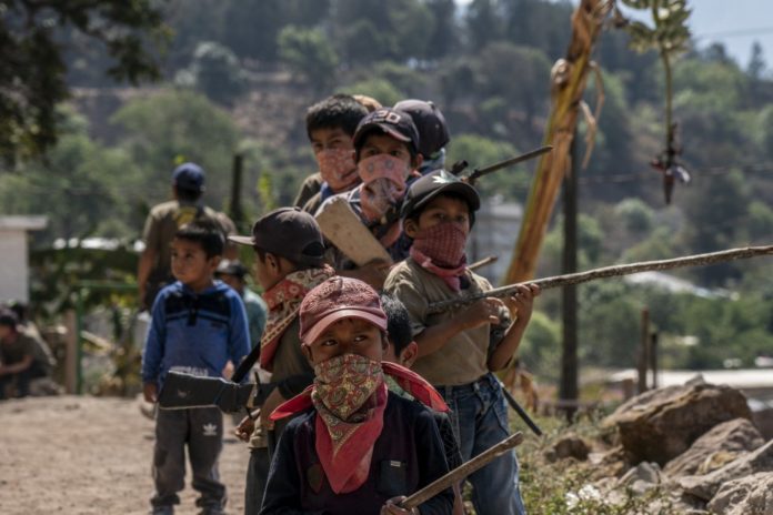 Este miércoles, en la comunidad indígena de Ayahualtempa, perteneciente al municipio de José Joaquín de Herrera y situada en la región central de Guerrero, miembros de la Coordinadora Regional de Autoridades Comunitaria-Pueblos Fundadores (CRAC-PF) juramentaron a un grupo compuesto por 5 niñas y 15 niños como nuevos integrantes, a quienes “armaron”, aunque algunos solo portaban carrizos simulando rifles.